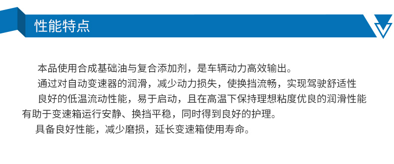 ●本品使用進口合成基礎油與進口復合添加劑,使車輛動力輸出通過對自動變速器的潤滑,減少動力損失,確保換擋流暢,實現(xiàn)駕駛舒適性;具備抗磨保護性能,減少磨損,延長變速箱使用壽命;本品適用于7速車輛,如奔馳于2010年6月21日之后 的7速722.9XX自動變速箱,也可用于寶馬、奧迪、大眾、路虎等較高要求的6速自動變速箱的乘用車。