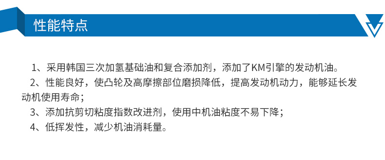●采用韓國三次加氫基礎(chǔ)油和進(jìn)口復(fù)合添加劑,特別添加了KM引擎的發(fā)動(dòng)機(jī)油。