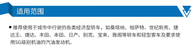 ●推薦使用于城市中行駛的各類經(jīng)濟(jì)型轎車,如桑塔納、帕薩特、世紀(jì)新秀、捷達(dá)****、捷達(dá)、豐田、本田、日產(chǎn)、別克、寶來、雅閣等轎車和輕型客車及要求使用SG級(jí)別機(jī)油的汽油發(fā)動(dòng)機(jī)。