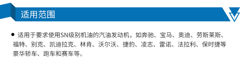 ●適用于要求使用SN級別機油的汽油發(fā)動機,如奔馳、寶馬、奧迪、勞斯萊斯、福特、別克、凱迪拉克、林肯、沃爾沃、捷豹、凌志、雷諾、法拉利、保時捷等豪華轎車、跑車和賽車等。